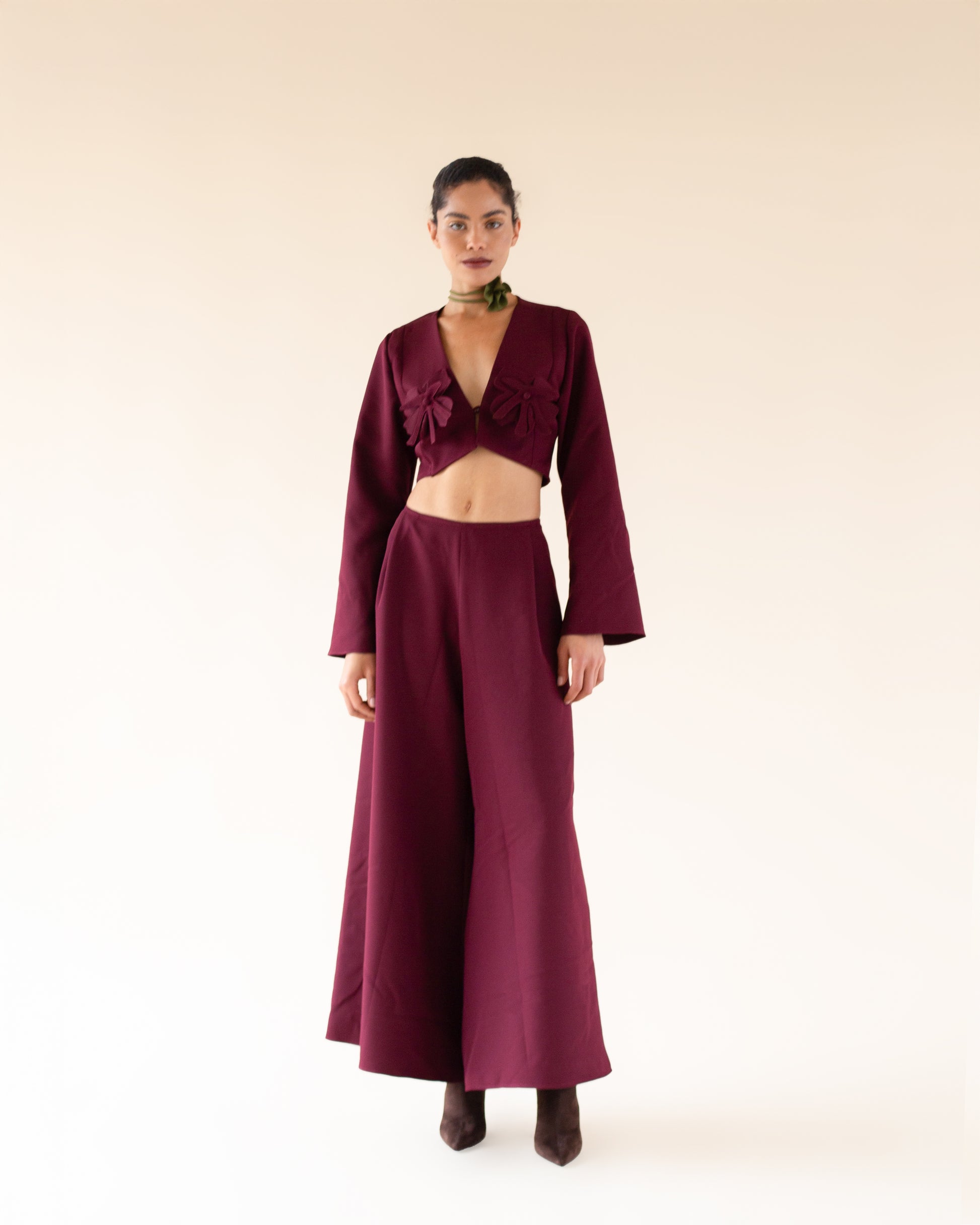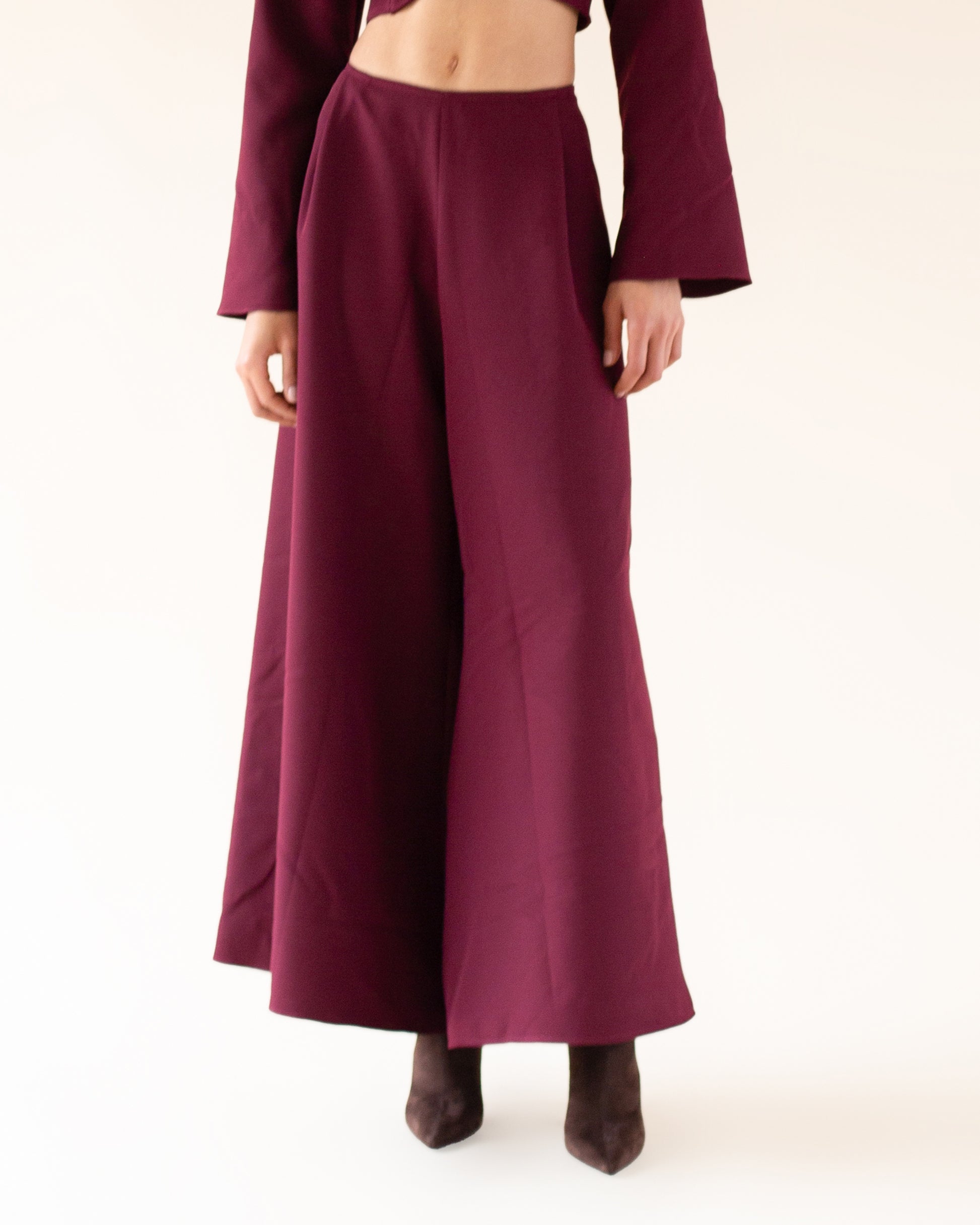 Pantalón sin costuras en costados, tiro alto y bota palazzo.