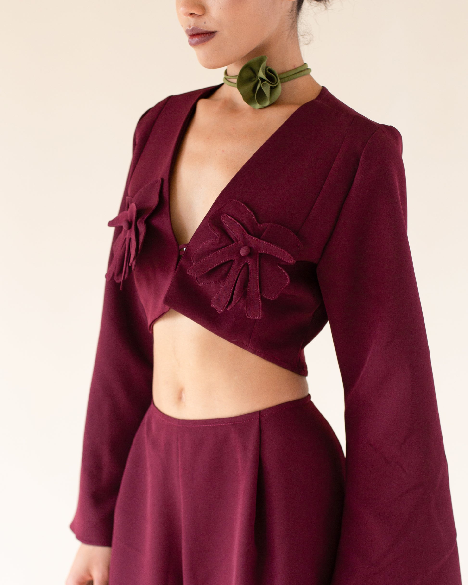 Top miidi, con flores hechas a mano y mangas acampanadas.