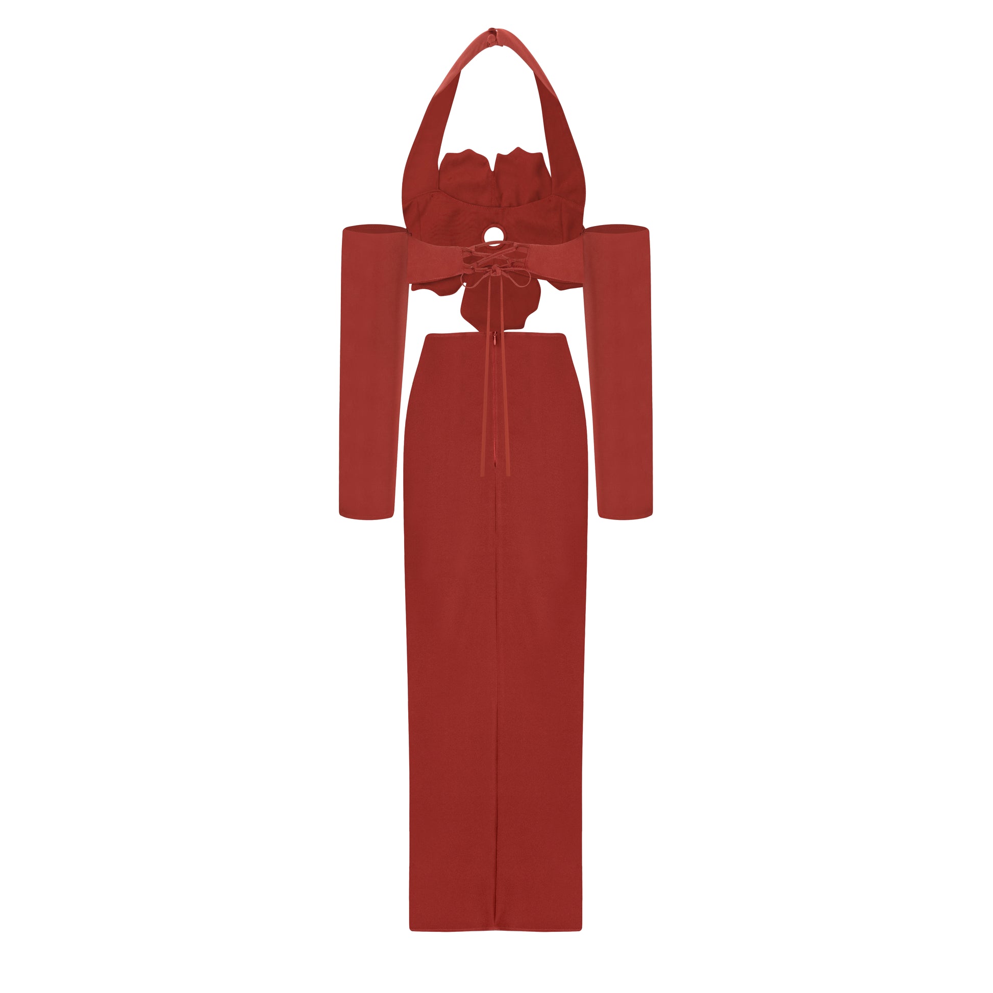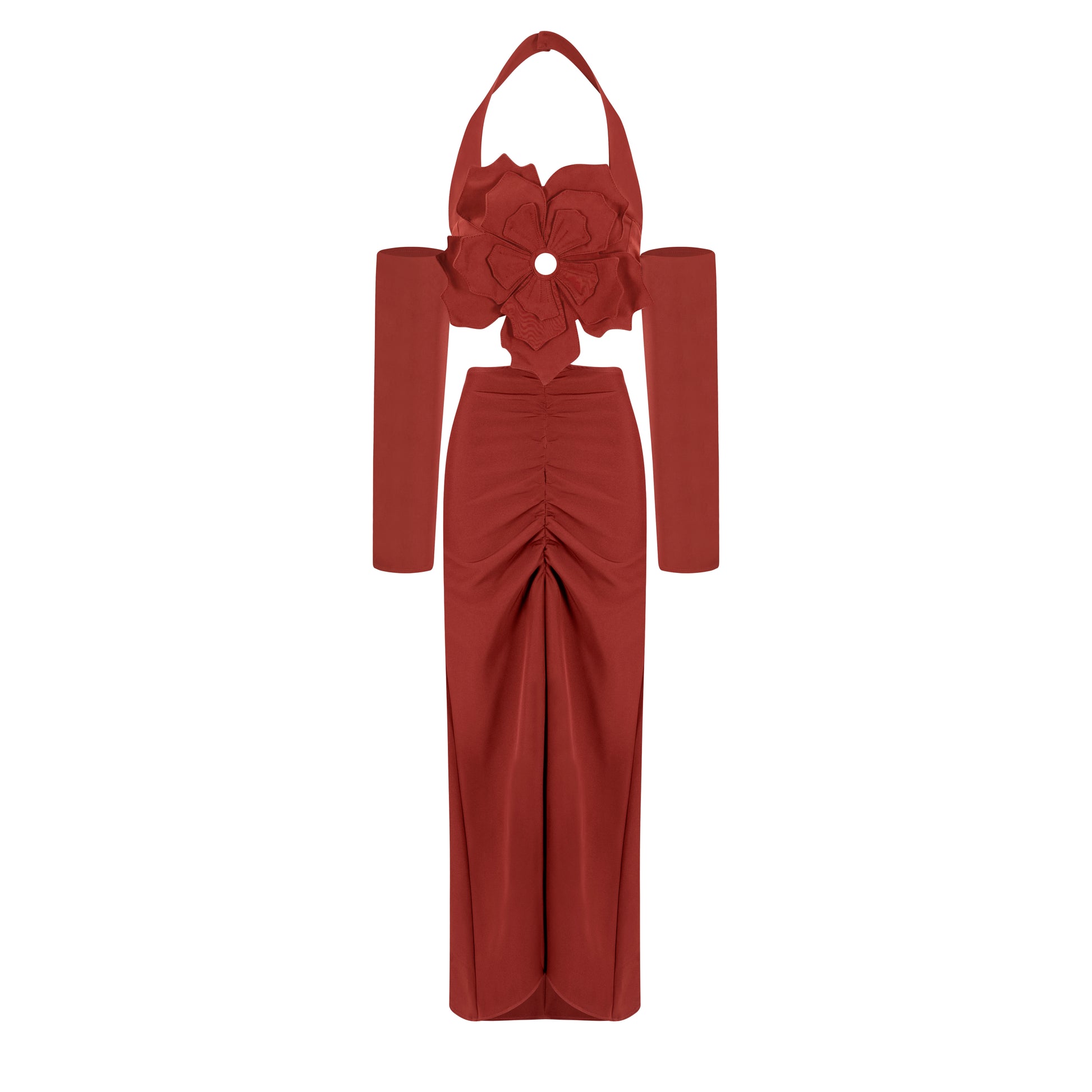 Vestido largo, falda con abertura delantera, top con flor en su centro, mangas caídas y tiras que se ajustan a tu cuello.