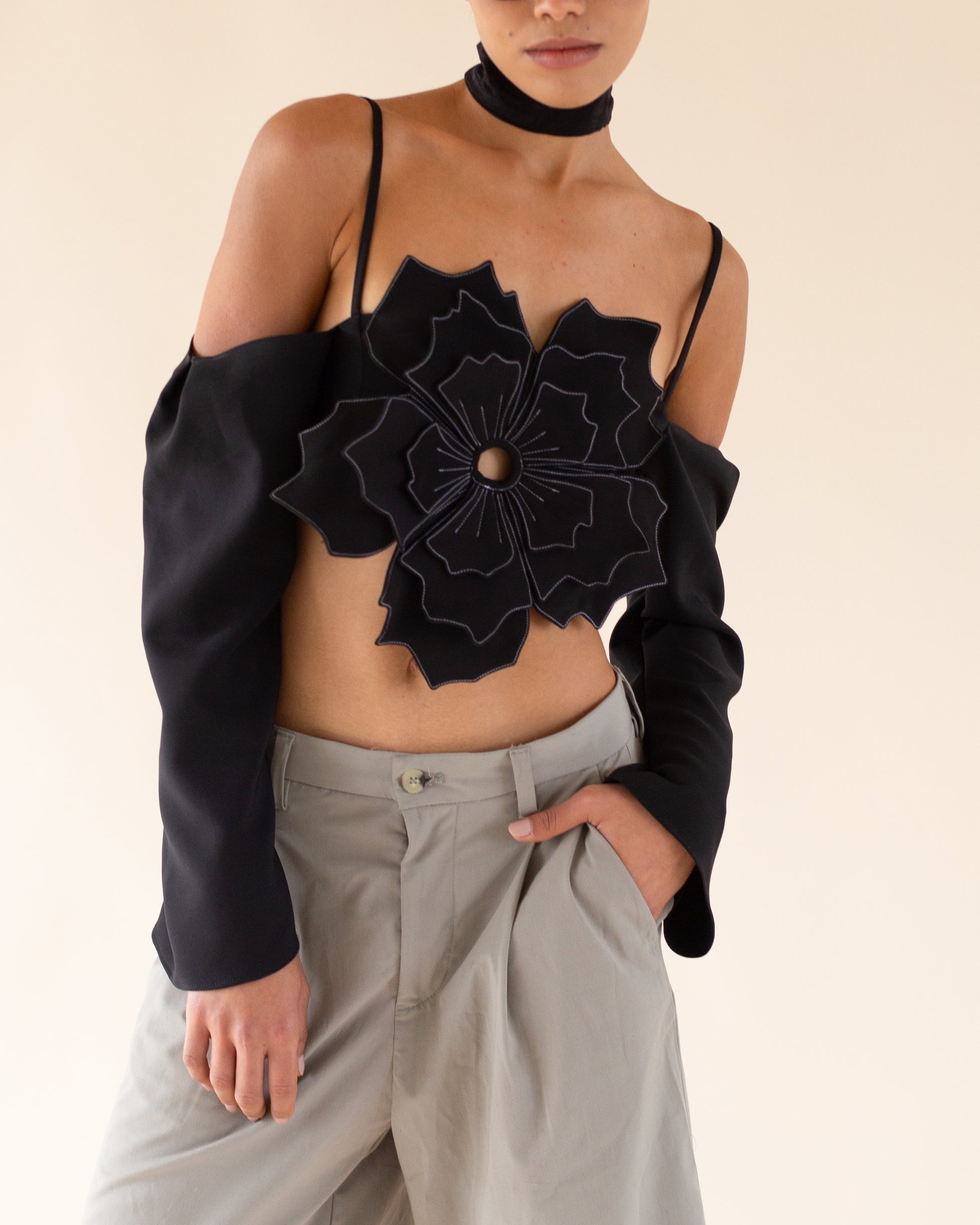 UN TOP UNICO Y ELEGANTE, CON UNA FLOR EN SU CENTRO, MANGAS SUELTAS Y LARGAS A LOS LADOS, TIRAS QUE SE CIERRAN EN EL CUELLO Y UNA ESPALDA DE AMARRE